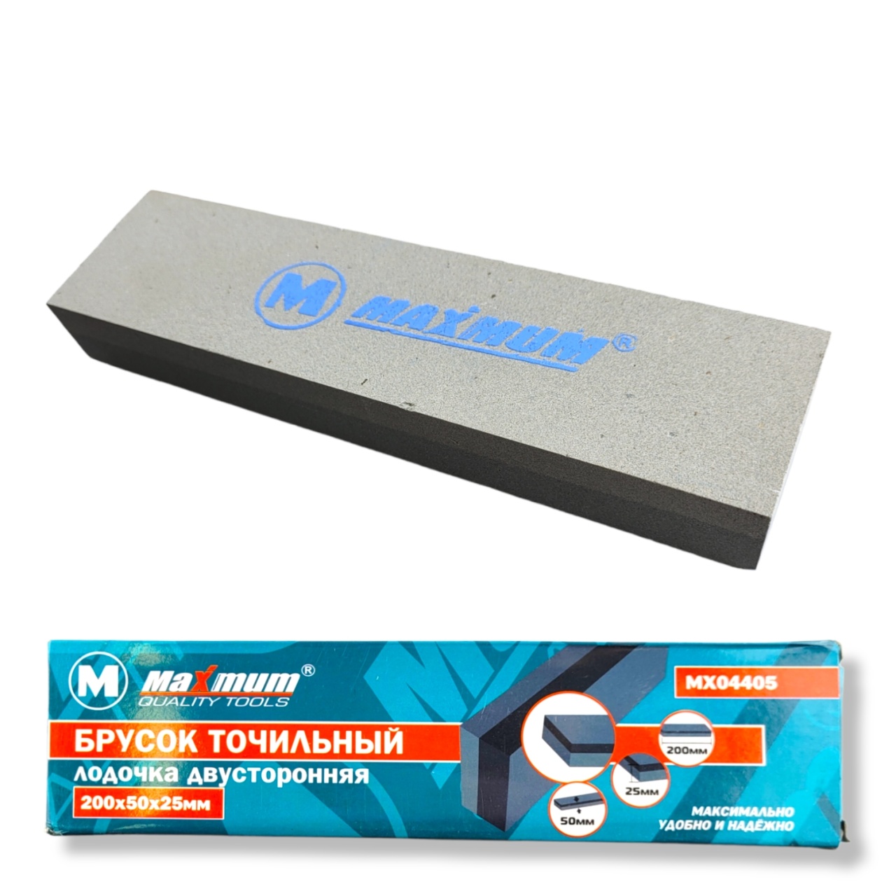 Удобная форма двухстороннего бруска для удержания в руке. Рекомендуется проводить работу по заточке и правке с использованием воды. Точильный брусок 200 мм "MAXIMUM QUALITY TOOLS" имеет два различных абразива.